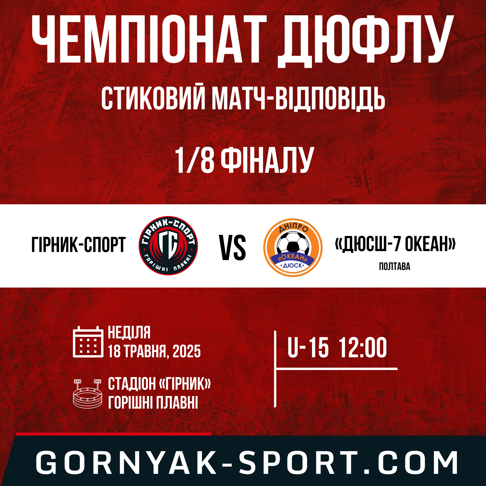 Гра юнаків із Горішніх Плавнів з гостями з міста Дніпро – це матч-відповідь у стиковому поєдинку 1/8 фіналу чемпіонату ДЮФЛУ. Гра пройде у неділю, 18 травня, на стадіоні «Гірник». Початок – о 12:00.