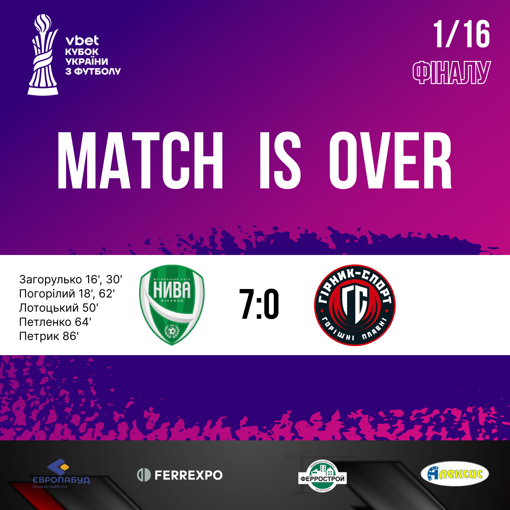 «Нива» (Вінниця) – «Гірник-Спорт» - 7:0. Голи: Загорулько Артур, 16 (1:0), Погорілий Владислав, 18 (2:0), Загорулько Артур, 30 (3:0), Лотоцький Борис, 50 (4:0), Погорілий Владислав, 62 (5:0), Артур Петленко, 64 (6:0), Артем Петрик, 86 (7:0)