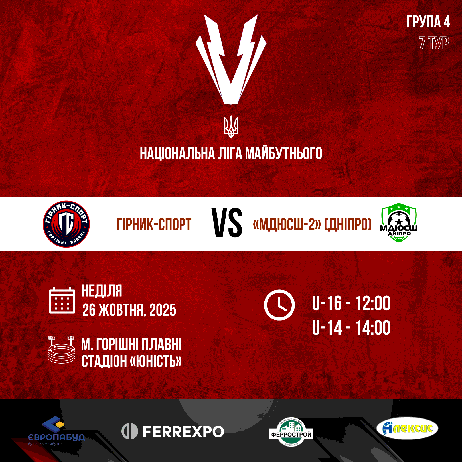 У неділю, 26 жовтня, дві команди ДЮФК «Гірник-Спорт» вікових категорій U-14 та U-16 прийматимуть суперників із команд «МДЮСШ-2» (Дніпро).
